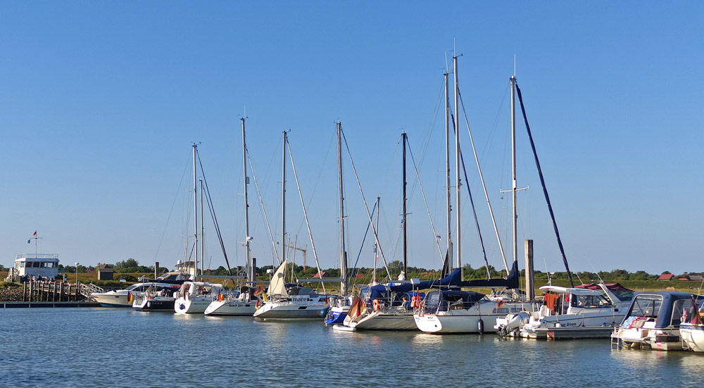 Ein Hafen mit immer ausreichend Wasser und wenig Schlickproblemen. Gastplätze vorwiegend längsseits am Oststeg oder sofern mit grün markiert auch in den Boxen.
