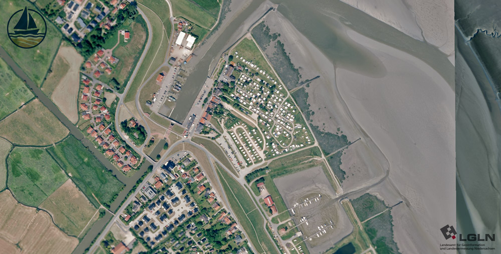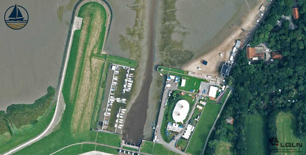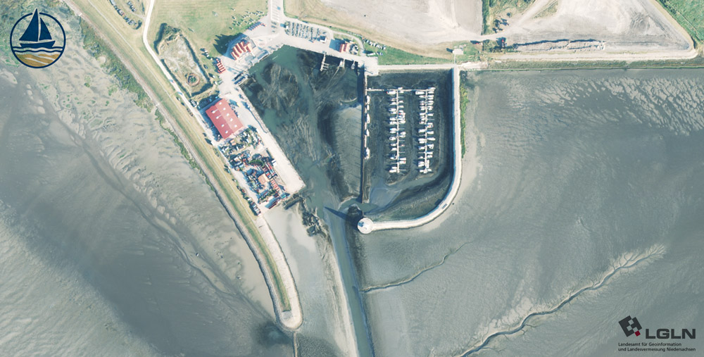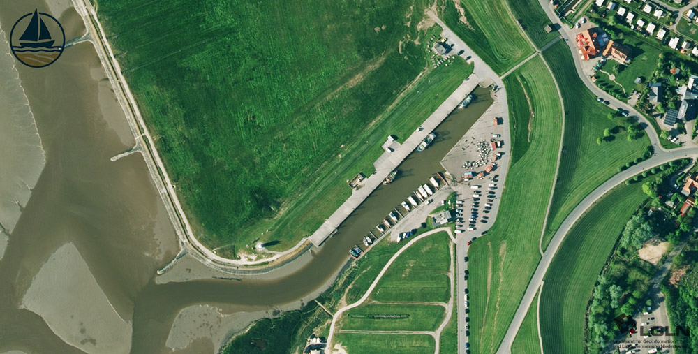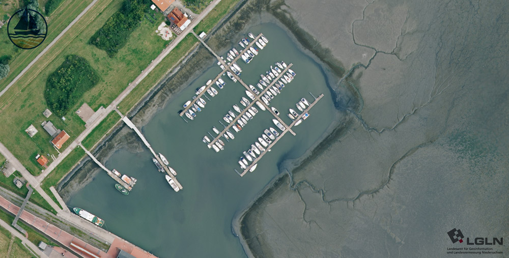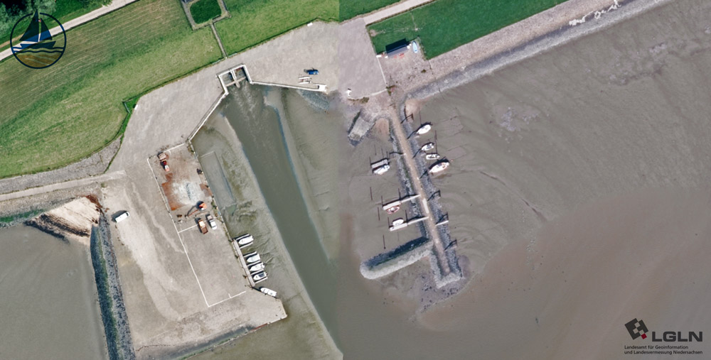 Wer den Priel am Fischerhafen vorbei weiter verfolgt, trifft auf den Jachthafen der Butjadinger, der frühestens mit halber Tide zugänglich ist. Der Hafen fällt weitgehend trocken.