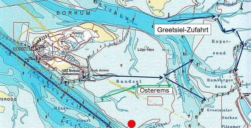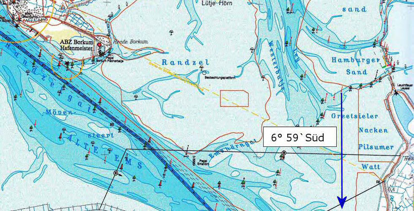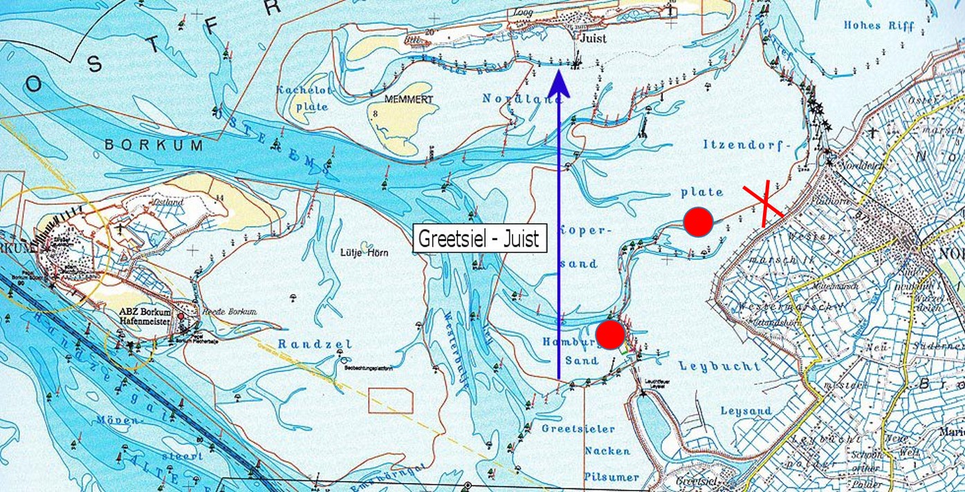 Ab Fischerbalje kann man inzwischen wieder ab 3 h vor HW Borkum direkt S-lich auf die Tonne 22 abhalten (Wassertiefe 2 h nach NW bereits 1,30m).