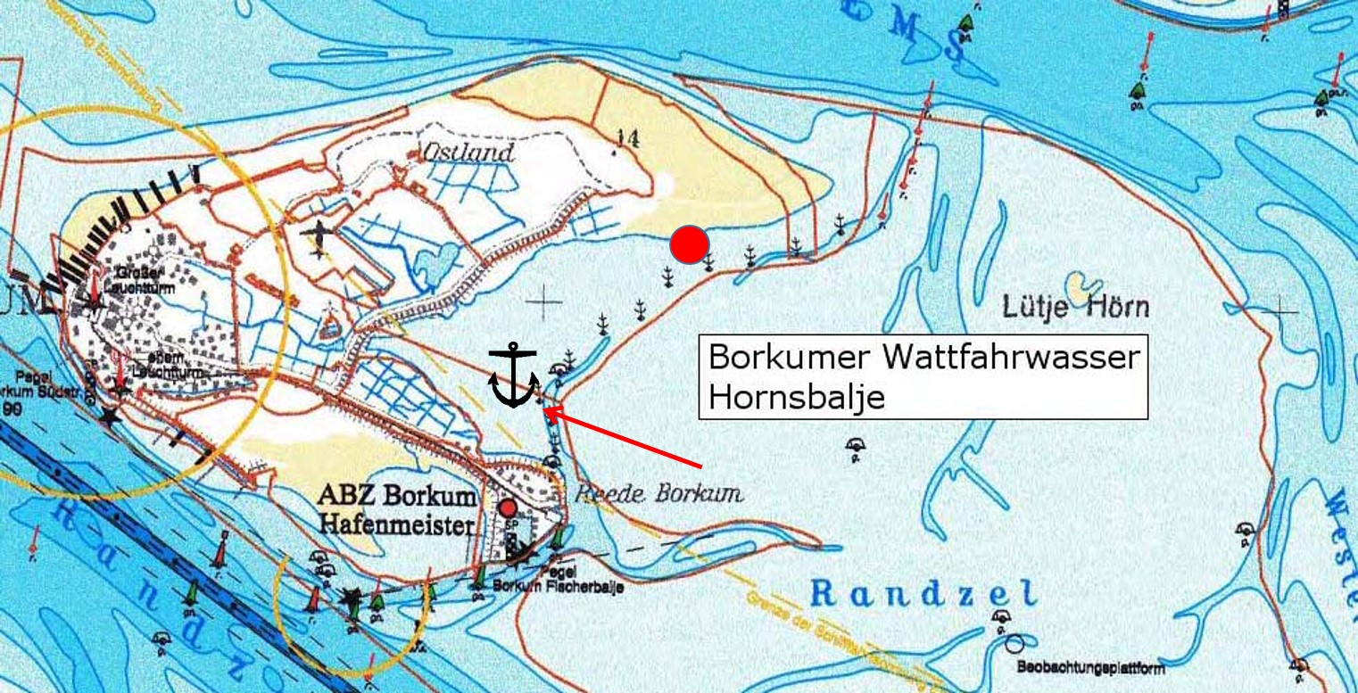 Im Borkumer Wfw. nördlich der Kabeltonnen guter Ankerplatz in einem Seitenpriel (in der Seekarte nicht eingezeichnet). Einen weiteren Ankerplatz gibt es am roten Punkt: 53°35,55'N, 6°47,93'E
