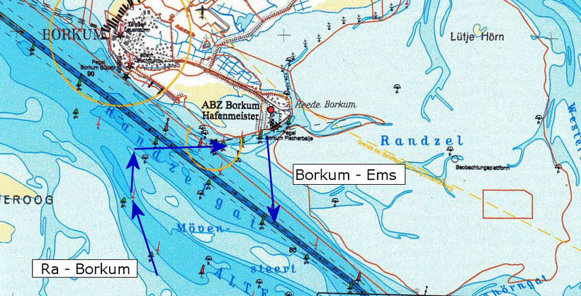 In aller Regel wird man hier in der ersten Phase des ablaufenden Wassers ankommen. Ab Ansteuerungstonne Ra ca. 340° nach A4 laufen. Bei ruhigem Wetter weiter ca. 15° zur gelben Tonne Borkum Reede 1 und dann 258° zum Feuer Fischerbalje. Die Sandbank in der Ems mit dem Namen Möwensteert sollte trotz inzwischen verbesserter Wassertiefe nicht gekreuzt werden, denn wegen ständiger Verlagerungen sind die Änderungen schneller als das Vermessungsschiff! Lange, kaum sichtbare Dünung der Nordsee verwandelt sich auf dem Möwensteert urplötzlich in Grundseen, die ein aufgelaufenes Schiff auf betonhartem Sand innerhalb kürzester Zeit zertrümmern können...