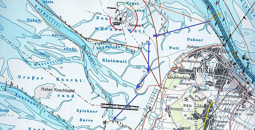 Von den Küstenvereinen habe ich die folgende Route erhalten, die für Boote bis 1 m Tiefgang gut zu machen ist, sich an den Schutzgebieten entlang mogelt und einen erheblichen Zeitgewinn bringt: 2 Std. vor HW in CUX auslaufen und gegen den Strom ca. 3 sm bis zu einem gelben befeuerten Pfahl SW-lich Tonne 27 laufen. Dort ist der Damm zum Watt soweit versackt, daß er problemlos gequert werden kann. Dann weiter zur Kreuzung von Prickenweg und Wattwagenweg. Inzwischen sollte dort soviel Wasser stehen, daß dieser passiert werden kann. Danach 180° zum Altoxstedter Tief und weiter ca. 200° bis Spieka-Ansteuerung.