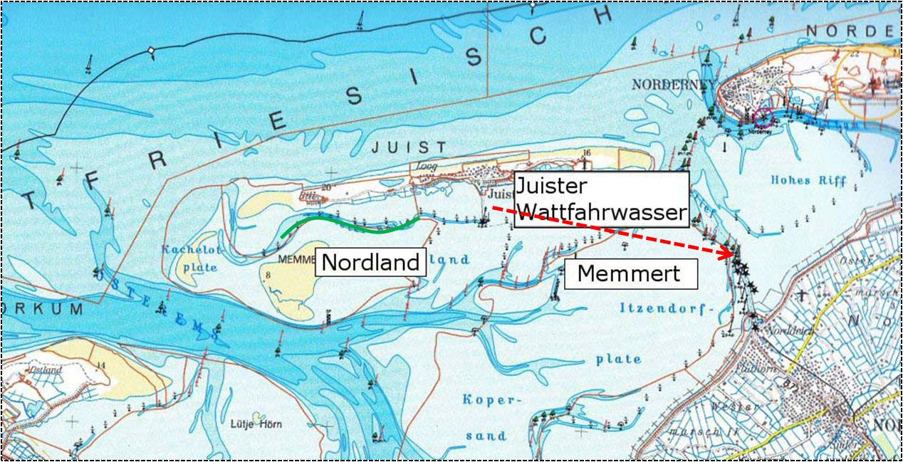 Gut bezeichnetes Wfw. ab Juist zur Memmert Balje. Im engen Fahrwasser ist es manchmal mühsam, den Juister Fähren auszuweichen. Die tiefe Rinne verlegt sich dauernd; nicht überrascht sein, wenn die etwa 1,40m tief gehenden Fähren sich nicht an die Fahrwasserbezeichnung halten und ungewöhnliche Wege fahren, die so nicht in der Seekarte stehen. Achtung: entlang des roten Pfeiles schnellfahrende kleine Fähren, die mit mehr als 20 kn unterwegs sind.