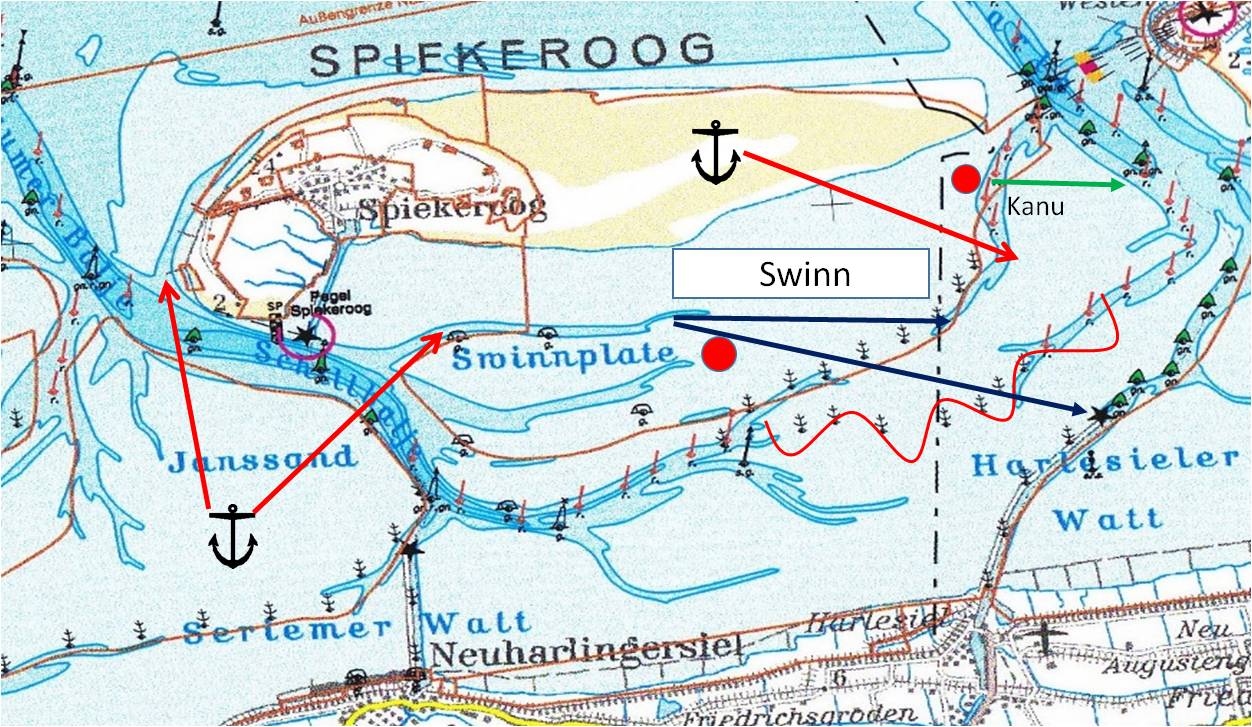 Über die Swinn führt der kürzeste Weg nach Wangerooge und Harlesiel. Zunächst den Eingang finden, indem man auf einer Linie zwischen OB 9 und der ersten Sperrgebietstonne (ziemlich kleine Tonne)* fährt. Dann ab 2. Sperrgebietstonne genau östlich ca. 3,0 sm bis AH 2A laufen und weiter der Betonnung nordöstlich nach Wangerooge folgen. Wassertiefe ca. 1,80 m 1 h vor HW Helgoland. In der Swinn kann man zwischen den Sperrgebietstonnen sehr gut ankern und fällt nicht oder nur kurzzeitig trocken.