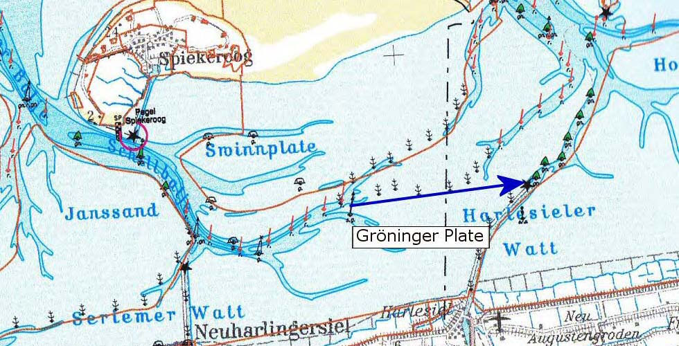 Im Harlesieler Wfw. auf der Gröninger Plate nördlich der Untiefentonne auf hartem Sand. Am Ostende gibt es einen Platz für Kanuten auf der Martensplate 53°45,55'N, 7°49,51'E mit Verbindung (grün) zur Dove Harle.