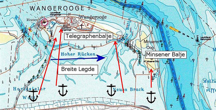 Gute Verbindung von der Telegraphenbalje zur Jade. Ab Sperrgebietstonne bei T 8 121 ° ca. 3 sm bis zum Rand des Robbenschutzgebietes und weiter 103 ° ca. 2,2 sm bis zur steilen Wattkante an der Jade. Bei HW Helgoland ca. 1,80 m Wasser. Achtung, im Bereich der S-lichen Blauen Balje je nach Tide deutlicher Stromversatz!. Die in der Seekarte eingezeichnete Stange am SW-Ende des Vogelschutzgebietes ist nicht vorhanden. Eigene Messung Mai 2022 1,20 m 2 h vor HW Helgoland. Neu ist eine Durchfahrterlaubnis in der Blauen Balje (Grüner Pfeil)