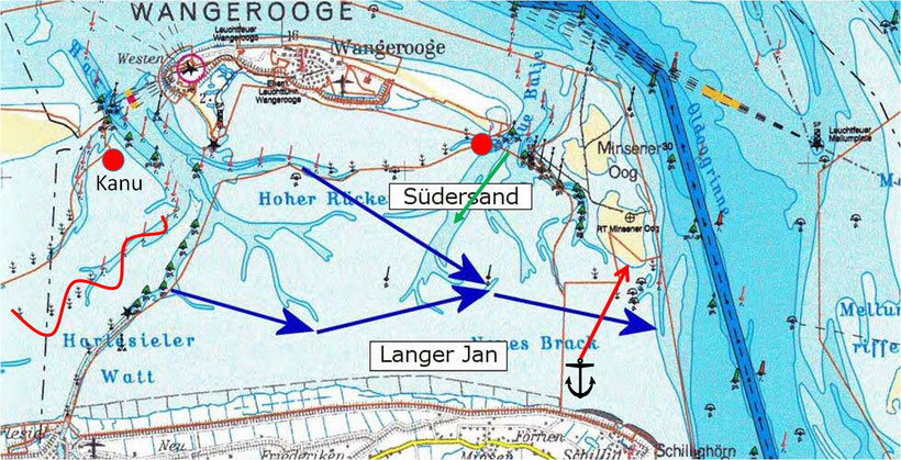 Gute Verbindung von Harlesiel zur Jade. Man kann von Harlesiel kommend bei H 19 ca. 2,8 sm 97° steuern, bis man 53° 44´ erreicht hat. Dann 74 ° ca. 2 sm bis zum Sperrgebietsrand und weiter 103 ° ca. 2,2 sm bis zur steilen Wattkante an der Jade. Es gibt auch Segler, die auf 53° 44´ durchfahren; wir haben es auch schon getan, allerdings finde ich die obige Route mit dem leichten Zick-Zack etwas stressfreier, vor allem am westlichen Ende. Wassertiefe 75 Minuten vor HW Helgoland 1,10 m.