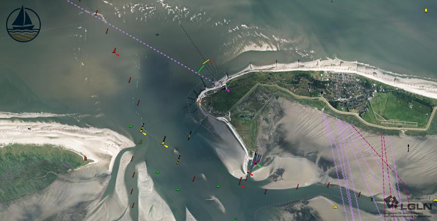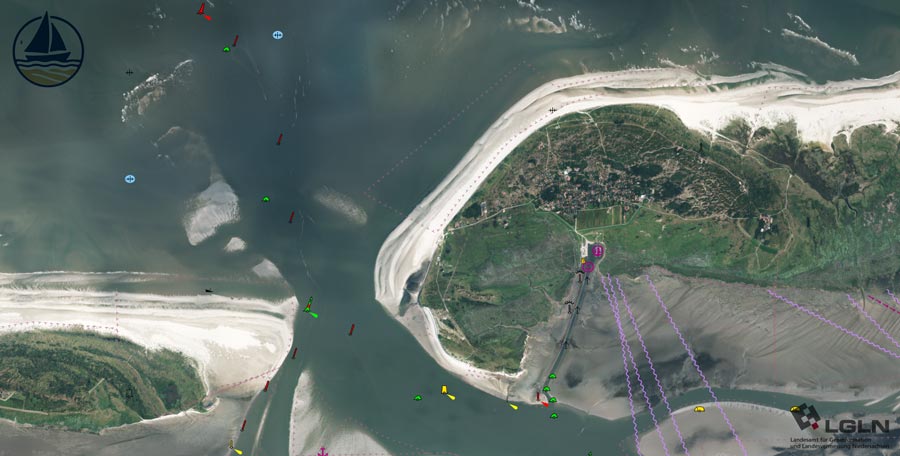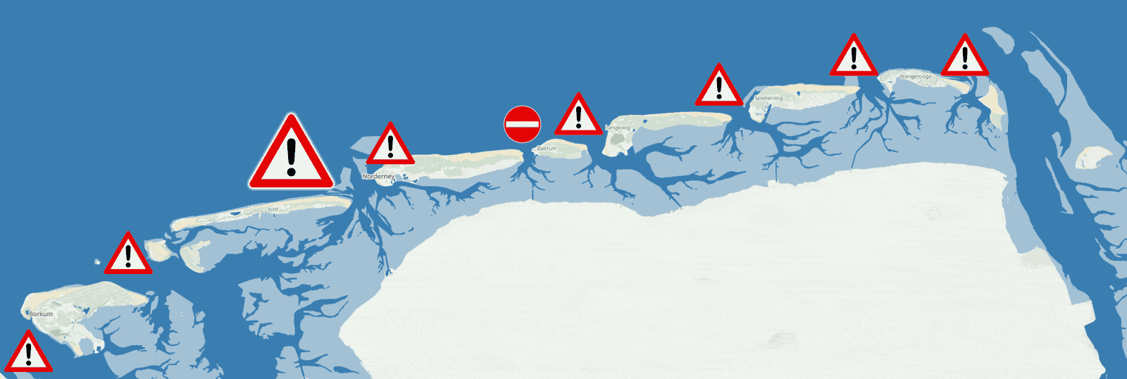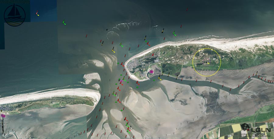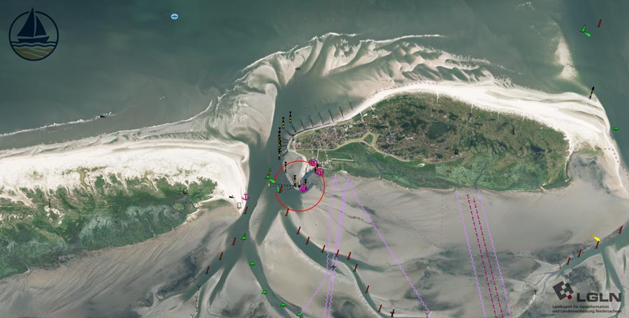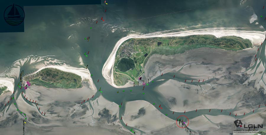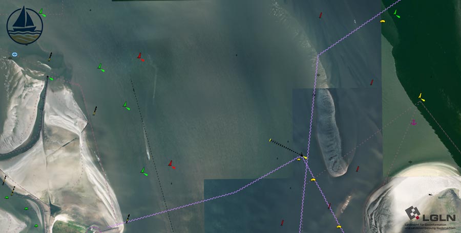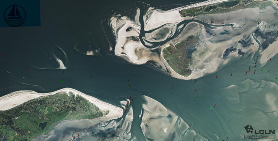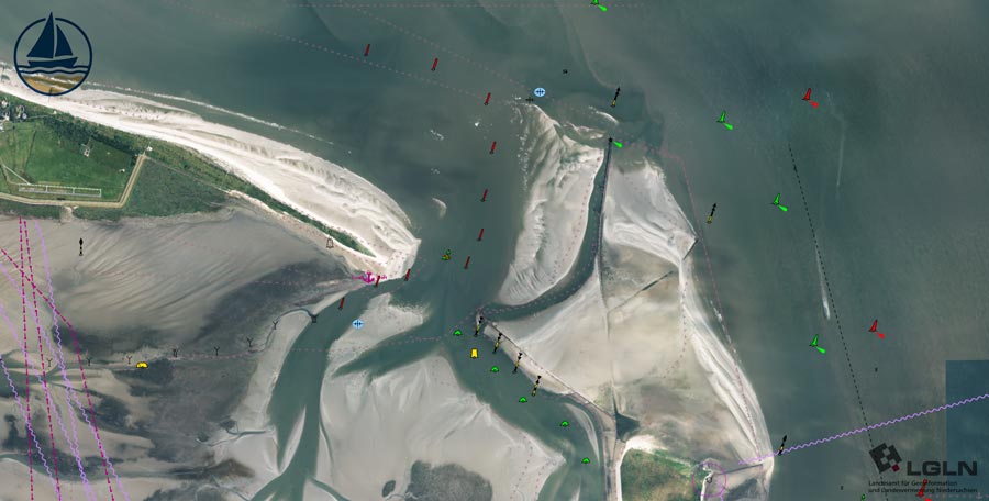 Die Zufahrt zum Wangerooger Hafen und die Weiterfahrt nach Harlesiel bzw. zur Telegraphenbalje ist durch eine hohe Sandbank deutlich verändert. Stets auf die Betonnung achten!
